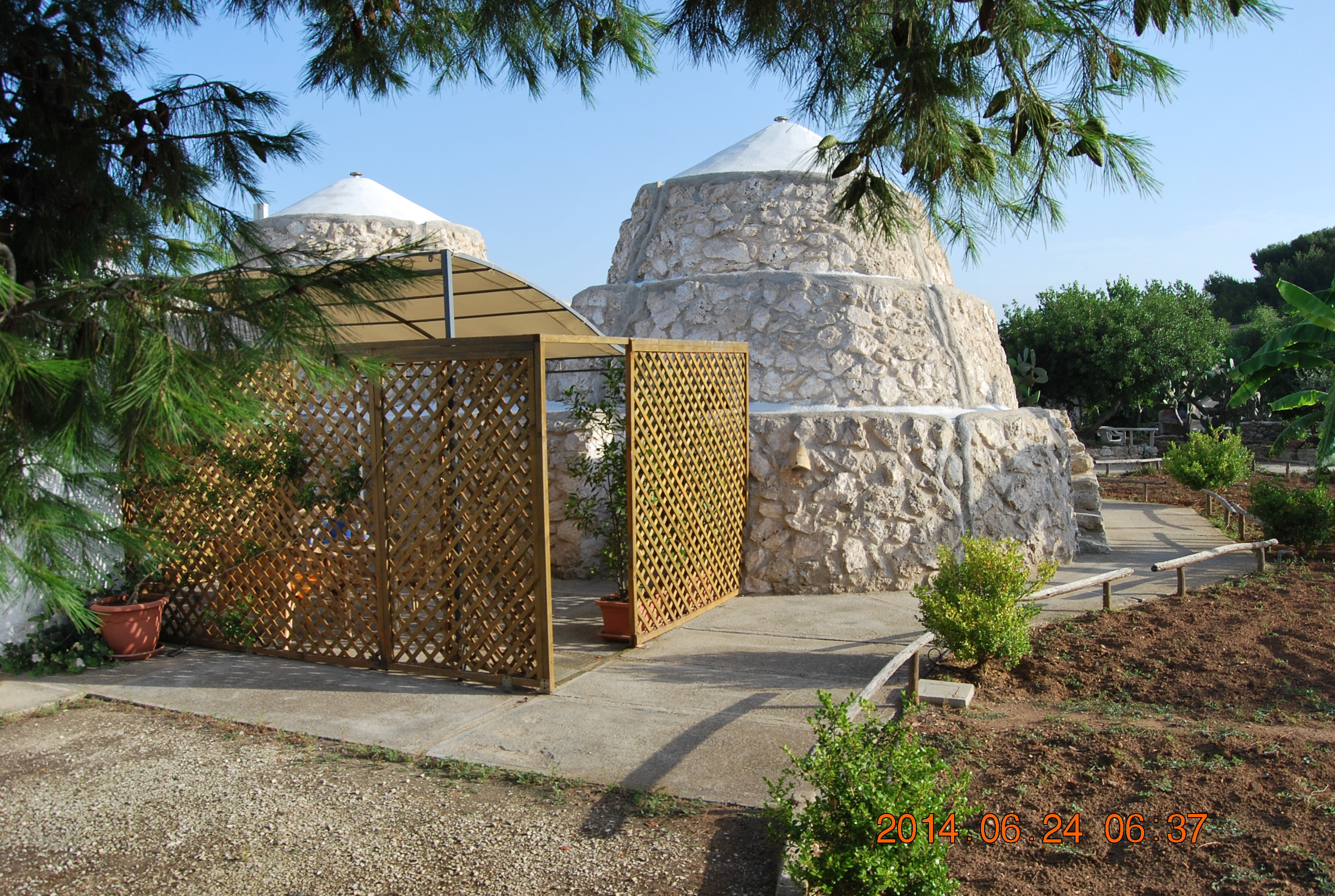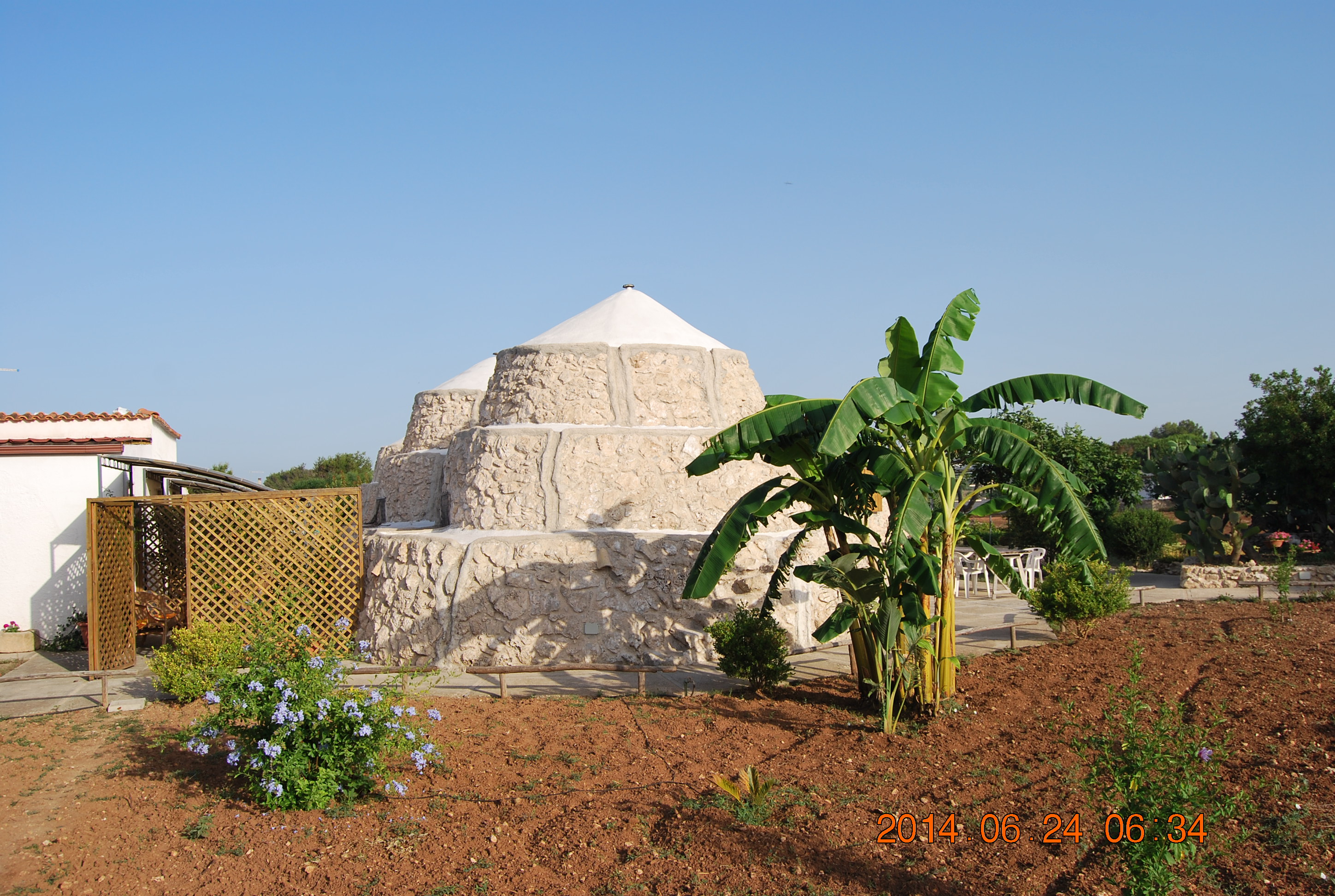 Så satte vi kursen sørover til Foligno, og deretter tok vi av østover, nok en gang over Appenninene, mot Civitanove Marche og Adriaterhavskysten. Så var vi atter på A14 som vi fulgte sørover. Mellom Foggia og Bari var temperaturen på sitt høyeste, med 35°C. Bare avbrutt av små pauser fulgte vi Autostradaen, fra Adriaterhavskysten over Le Murge, til Massafra, hvor vi kunne se ned til det Ioniske hav. Derfra fulgte vi Via Appia inn til Tarantobukten. Kjørte over stredet på Ponta Penna, ei høy bru med god utsikt over byen. Deretter ble det smalere bygater, og vi tok av i San Giorgio Ionico til enda smalere landsbyveier. Vi kom fram til Torricella, men da ville ikke GPS-en mer. Vi spurte to eldre damer etter veien til Torre Ovo, og plutselig var det mange som ville hjelpe oss. En ung gutt kasta seg i bilen og kjørte foran for å vise oss veien, og tok en telefon til eieren av B&B Antico Podere, som kom og møtte oss for å vise oss veien helt frem. Snakk om sjenerøsitet og velvilje! Vi ankom stedet rundt kl.18.30 og fikk tildelt en trullo. Den sympatiske eieren tilbød oss gang på gang en finere leilighet i stedet, men det var jo en overnatting i en gammeldags TRULLO vi ønsket! Dessuten så den innbydende ut, med en liten intim patio utenfor; som også førte til baderommet, i tillegg til inngangsporten.