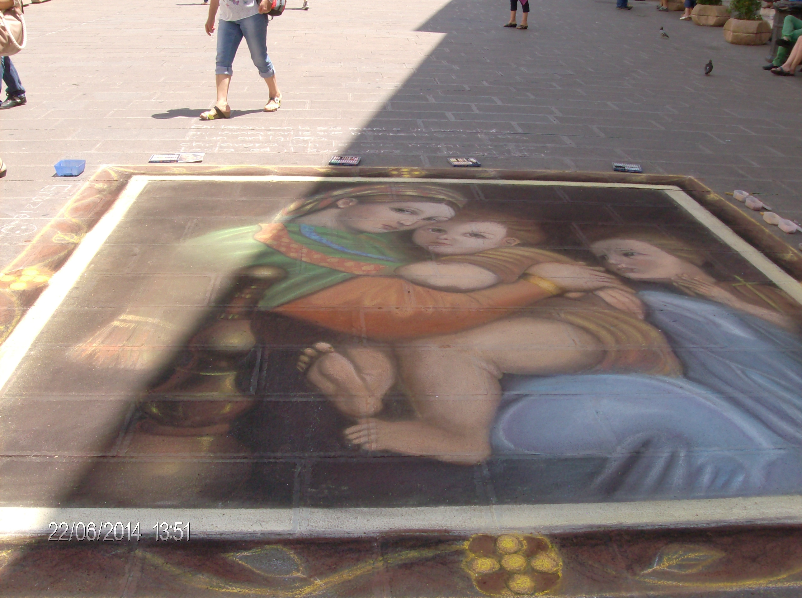 Etter hvert kom vi til piazza dell commune, hvor vi satte oss ned og tittet på alt rundt oss, deriblant en kunstner som malte et vakkert bilde med kullstift direkte på asfalten. Vi kjøpte en aquarell av malerkollegaen.