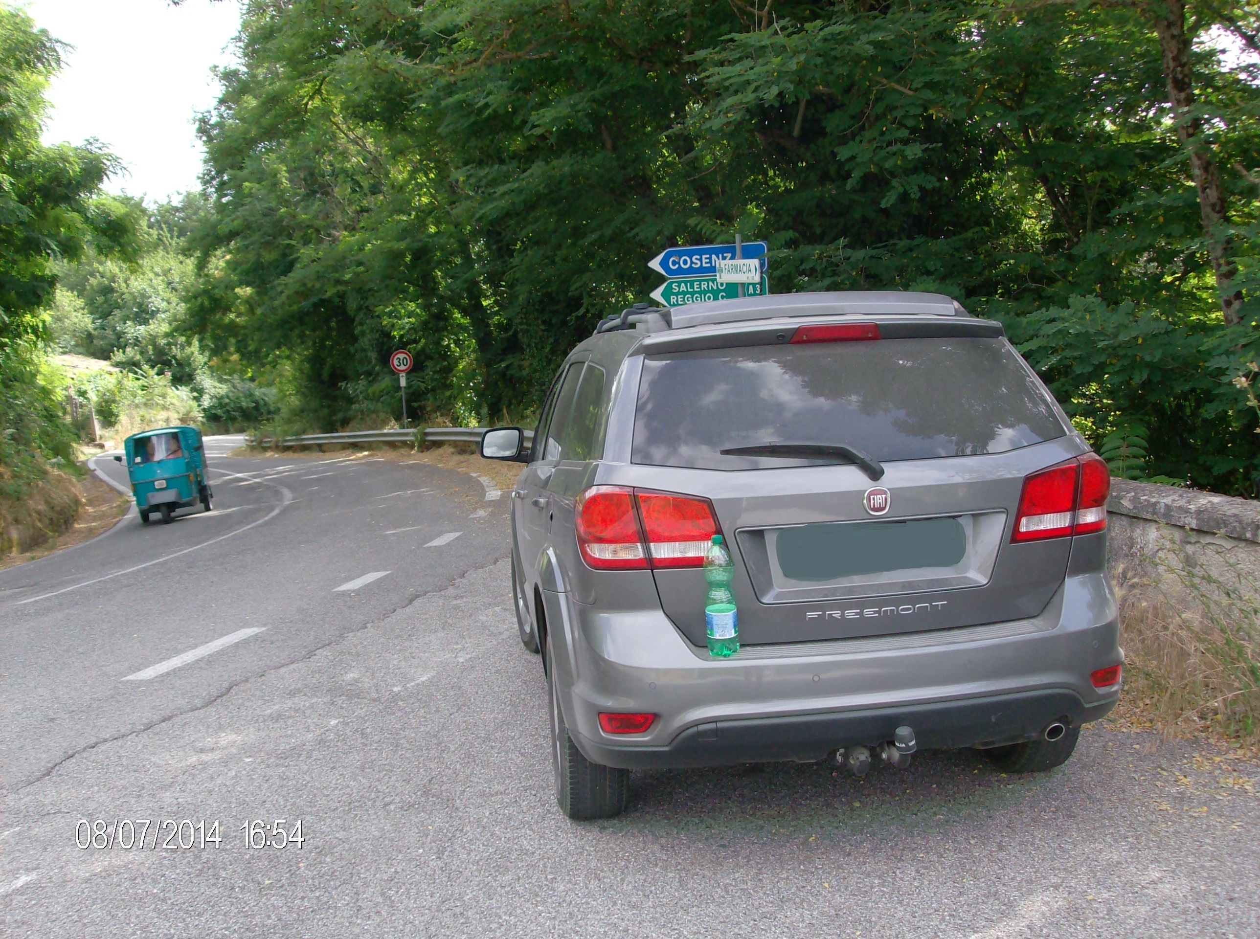 Fra Carpanzano svinga veien nedover til et juv og opp igjen på andre siden, forbi en liten by kalt Marzi og videre til den noe større byen Rogliamo, hvor vi omsider kom inn på Autostradaen igjen. Vi fulgte A3 og tok av mot Altomonte. Vakkert landskap, lange flate oppdyrka marker omkranset av åser østover og sørover, og av høye fjell i bakkant vestover og nordover. Vi satte på nødblink og stoppet for å ta bilder. To biler passerte, og begge stoppet for å tilby hjelp!