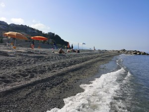 Vi tok på oss badetøy og kom oss avgårde i 29 grader. Først til panificioen hvor vi kjøpte med 2 calzone til å spise på stranda. De var kjempegode. Etterpå var vi innom strandbar la Boheme og tok en kruttsterk espresso, ettersom Inger fikk et akutt behov for å kurere gruff. Deretter ble det bading og soling fra kl. 08.30 til 10.30. Veldig mykt og behagelig vann! Da vi kjørte hjem, tippa temperaturen over 40 grader.