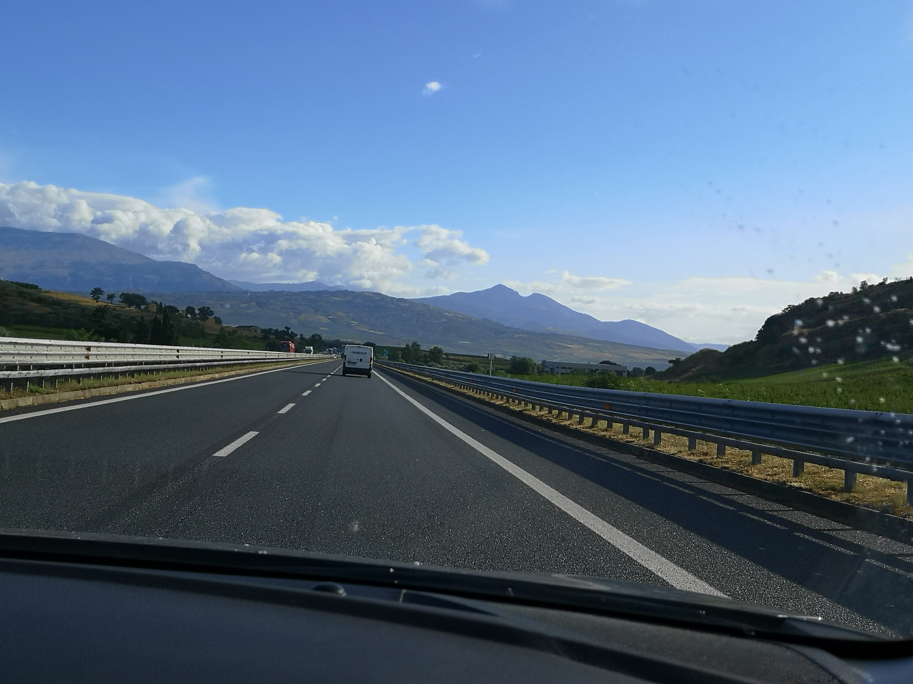 For å unngå virus-smitte tok vi en del forholdsregler, deriblant å sove i bilen. Derfor alle disse klokkeslettene, for å dokumentere tidsbruken, for å være forberedt til neste sommer med bil fra det nordligste punktet på kontinentet i Europa, altså Hirtshals, Danmark, til lengst sør, Calabria, Italia, en distanse på nær 3 000 km.