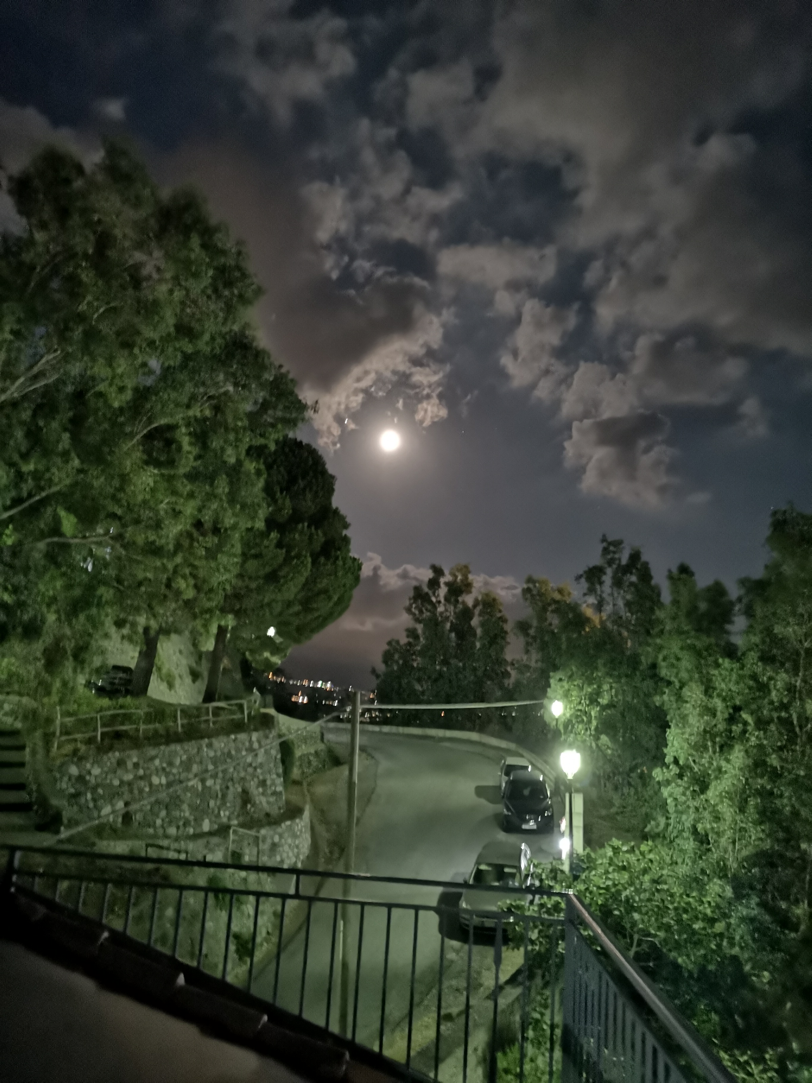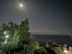 Om kvelden satt vi på takterrassen og så på fullmånen og vakker, trolsk nattebelysning før vi entra solsenga for natta.